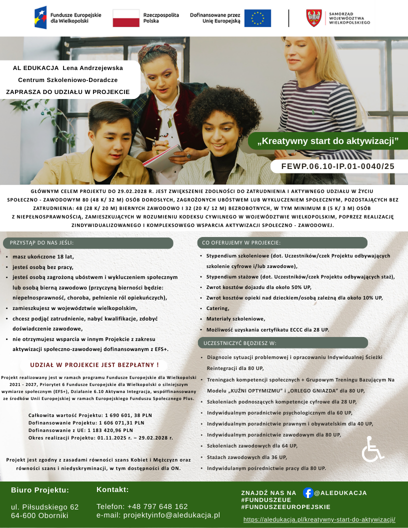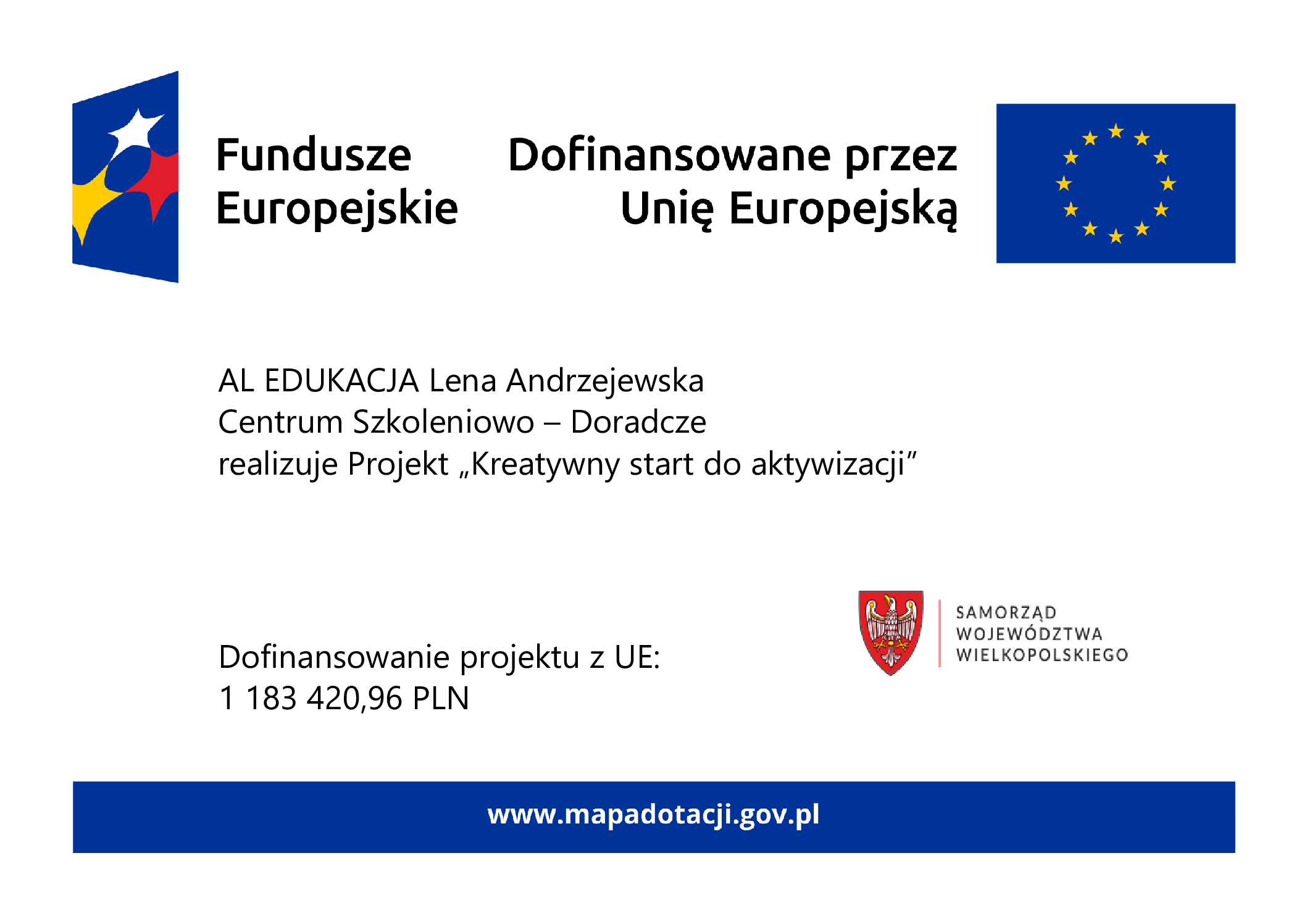 AL EDUKACJA Lena Andrzejewska Centrum Szkoleniowo – Doradcze zaprasza do udziału w Projekcie pod nazwą „Kreatywny start do aktywizacji” nr FEWP.06.10-IP.01-0040/25.